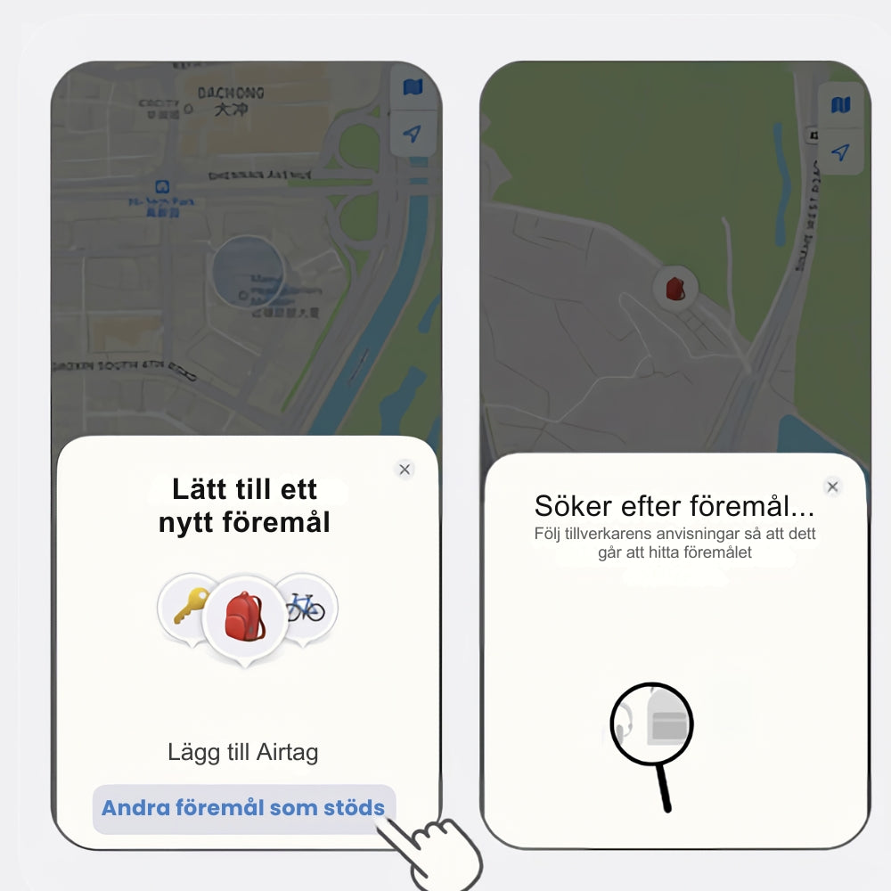 På iPhone kopplas den till Apples “Hitta” (Find My) och använder Apples globala nätverk av enheter för att visa platsen.